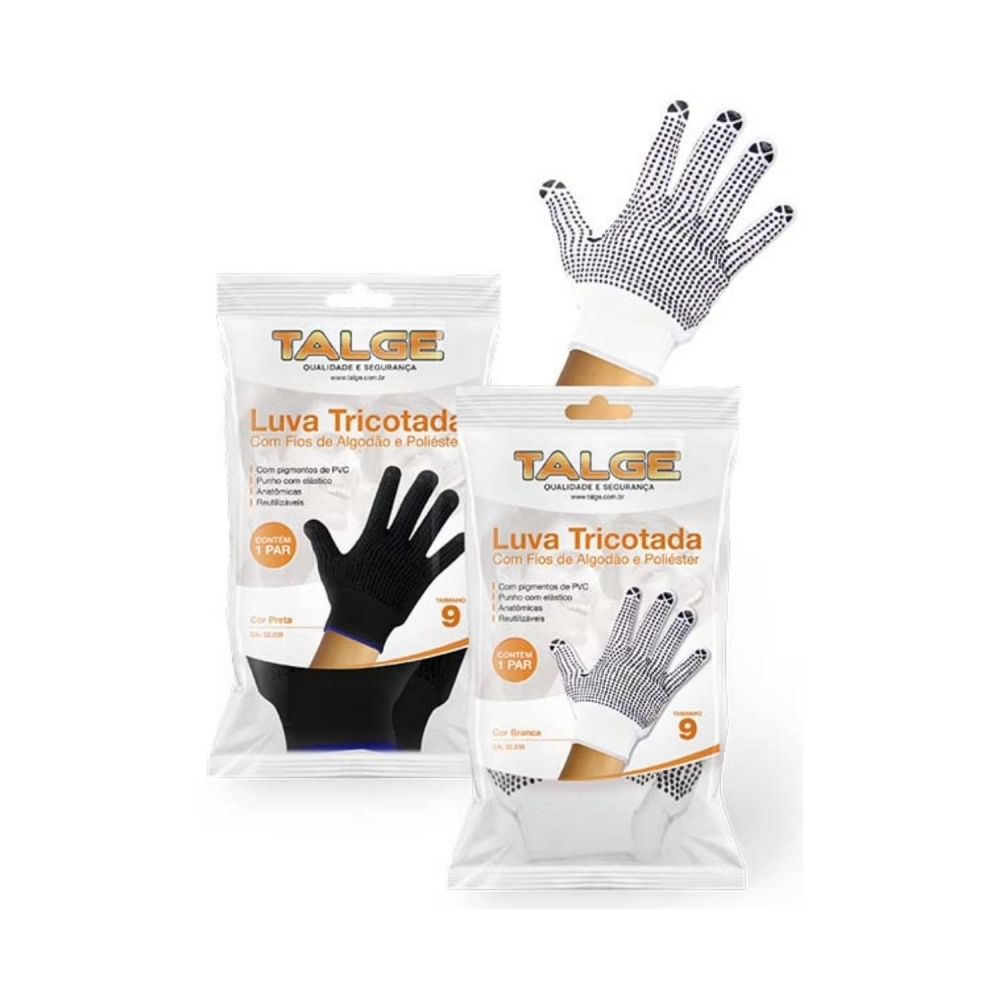 Luvas de segurança tricotadas em quatro fios de algodão e poliéster, punhos com elástico, não estéreis, reutilizáveis, anatômicas com antiderrapante em aplicações de pigmentos de PVC na face palmar e dedos evitando o escorregamento e melhorando a produtividade.