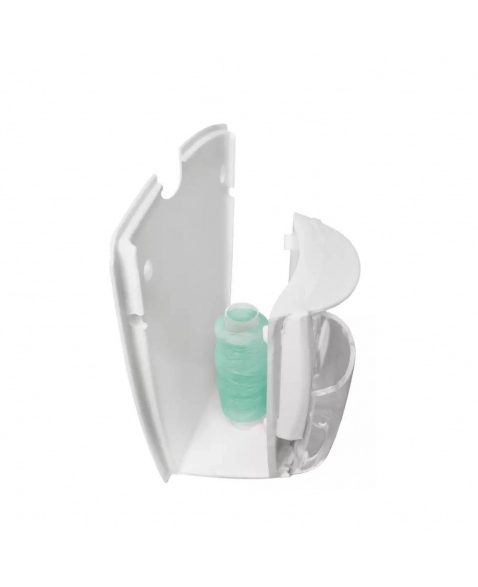 Suporte plástico de parede para fio dental, com corte manual e visor acrílico protetor.